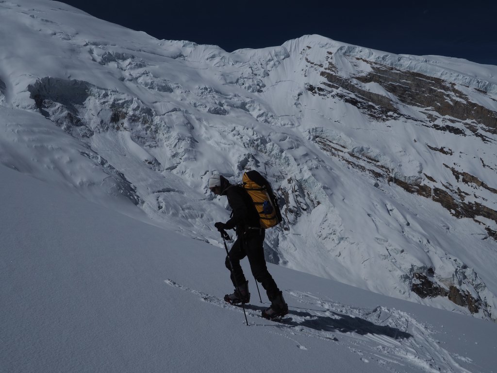 The next day is also greeted by bright sunshine. We take advantage of the good weather to prepare our equipment and familiarize ourselves with the surroundings. Hiro, Digo and our cook watch the action carefully. They have never seen a splitboard before and ask one question after another. Our excursion on the wide slopes with a rapid descent completely convinces them of the advantages and quality of this system, and over dinner we discuss the planning and distribution of equipment for the high camp. Our accompanying officer Digo also wants to come with us and is not deterred despite our - admittedly - half-hearted attempt to talk him out of climbing in normal shoes. With the obligatory porridge (oatmeal) in our stomachs, we finally set off together the next morning, fully packed, to Camp 1 at 5,230 meters.