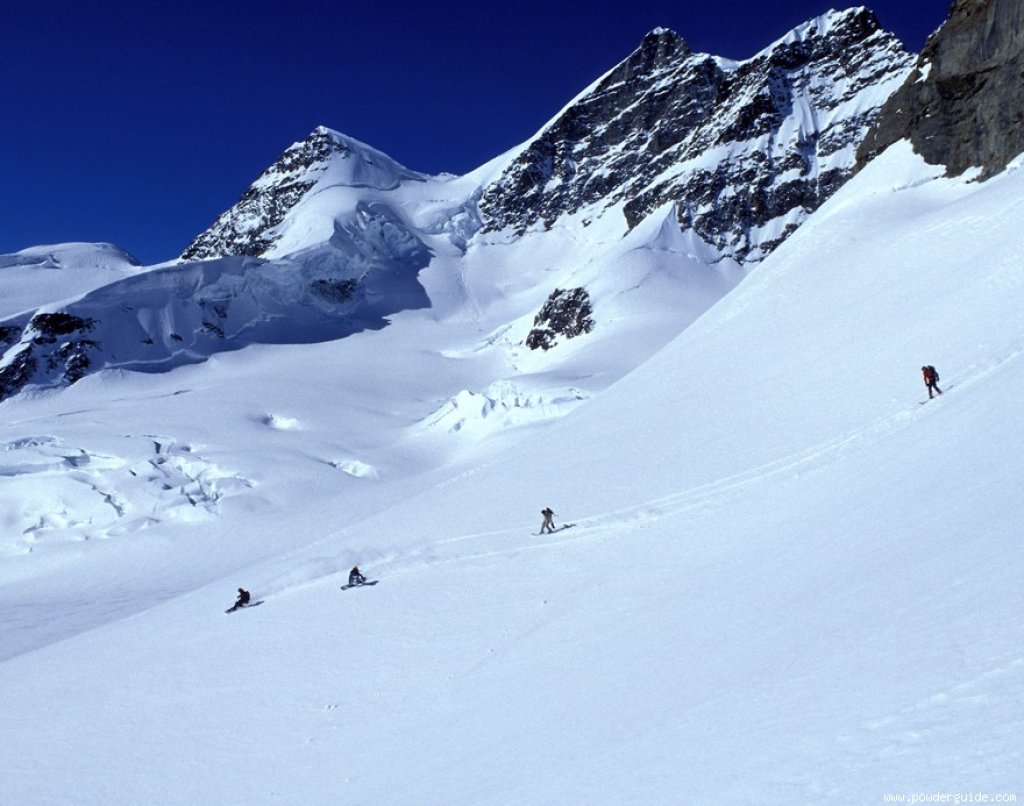 After putting on our harnesses, we are ready to go. We shoot down the fairly flat Jungfrau Glacier at high speed through a few centimetres of powder snow. Luckily there hasn't been any more fresh snow, otherwise the motto would be "walk and talk". We cruise relaxed in giant turns for around 7 kilometres across the flat glacier. The ice beneath us is up to 800 metres thick. And the crevasses can be 100 metres deep! In respectful arcs, we skirt around every suspected crevasse. The tour leads along the western side (right) of the glacier to Konkordiaplatz. Caution: the tour is a classic "firn tour" - if there is a lot of powder, you need a powerful outboard skier ...