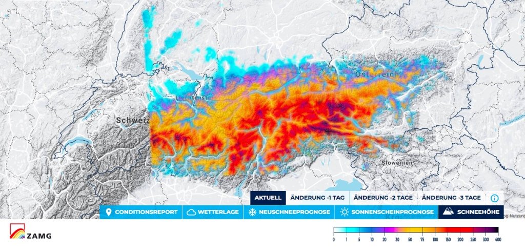 Auch unsere restlichen Wetterdaten sind von der ZAMG und wir bedanken uns an dieser Stelle für die langjährige und immer angenehme Zusammenarbeit! Wenn ihr jetzt noch SNOWGRID auf die Westalpen ausdehnt, liebe ZAMG, dann wären wir wunschlos glücklich!