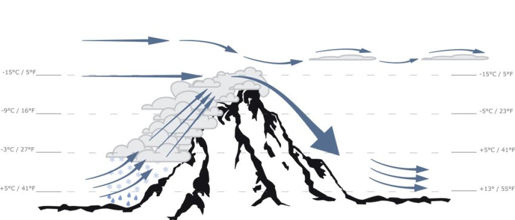 Föhn entsteht, wenn feuchte Luft über ein Gebirge bzw. einen Berg strömt. Dabei müssen die Luftmassen aufsteigen, wobei sie sich abkühlen. Feuchte Luft wird alle 100 Höhenmeter um rund 0,5 Grad C kälter. Kalte Luft kann jedoch weniger Feuchtigkeit aufnehmen als warme, weshalb die Wolken immer dichter werden, bis sie die Feuchtigkeit nicht mehr halten können. In den Staulagen der Gebirge sind oft ergiebige Niederschläge die Folge und die Luft verliert einen großen Teil des Wassers – dabei wird die Luft trockener. Der entscheidende Effekt für den Föhn liegt darin, dass die bereits recht trockene Luft auf der Lee-Seite des Gebirges in die Täler sinkt – und sich dabei um ca. 1 Grad C pro 100 Höhenmeter erwärmt. Die Erwärmung ist etwa doppelt so stark, wie die vorherige Abkühlung. Und durch die starke Erwärmung kann die Luft mehr Feuchtigkeit aufnehmen, was zur Folge hat, dass sich die Wolken (fast) vollständig auflösen. Föhn ist ein (relativ) warmer und trockener Wind. Und nicht umsonst wurde der Föhn in Amerika von den Indianern "Chinook – the snow eater" getauft.