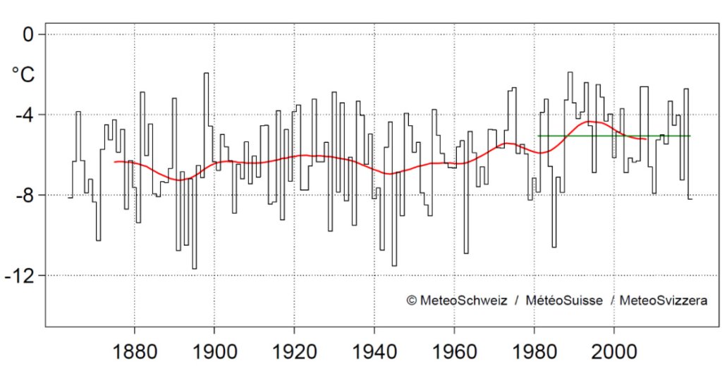 Die Januartemperatur in Berglagen der Alpennordseite über 1000 m seit Messbeginn 1864. Die rote Linie zeigt das 30-jährige gleitende Mittel, die grüne Linie die Januarnorm 1981‒2010 von -5.1 Grad.