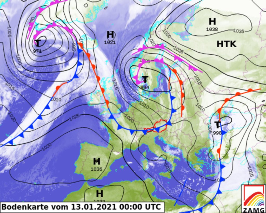 Frontenkarte, 13.1.21. Derzeit liegt eine langgezogene Kaltfront am Alpenbogen an. Bereits in der Nach ist die Warmfront von Tief Dimitrios durch gezogen. Das nächste Tief steht schon vor der Tür und wird heute Abend und morgen noch mitmischen.